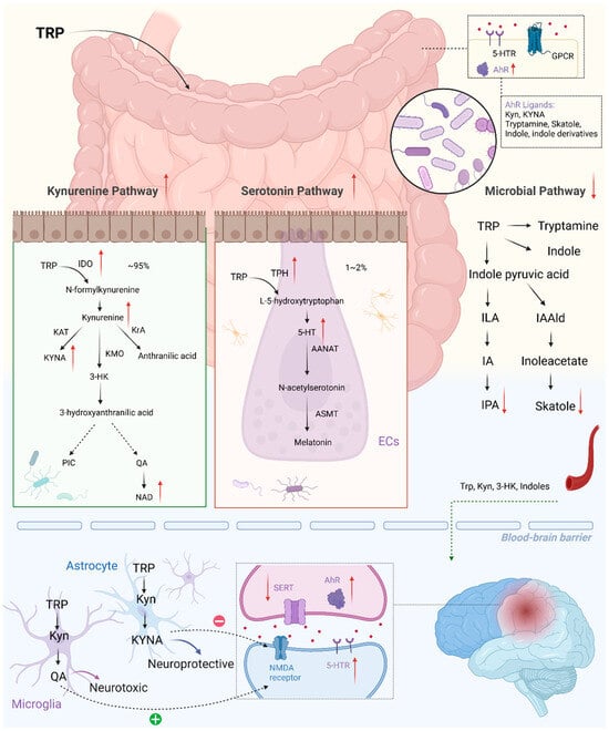 There is a growing appreciation for tryptophan metabolism along the microbiota–gut–brain axis, which has close associations with stroke. As an essential amino acid, tryptophan mainly originates from the digestion of dietary proteins in the small intestine []. Trp is metabolized via three major pathways, with a series of important metabolites in the gut and brain, which experience significant alterations during stroke (Figure 3), exerting a profound effect on the physiological and pathological processes.