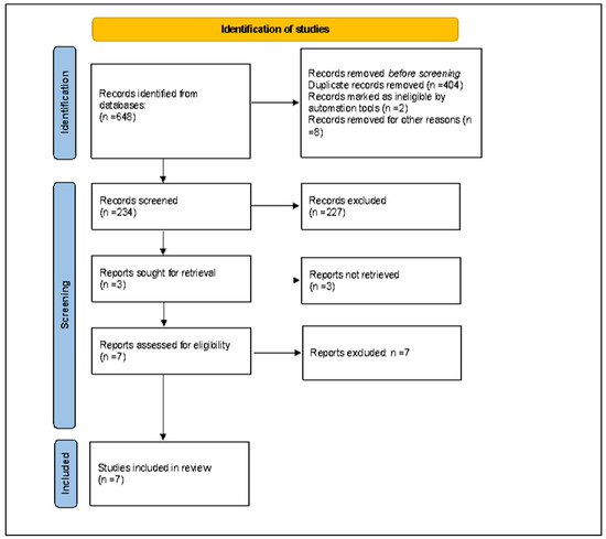 The first systematic literature search generated 648 entries. After eliminating duplicates, 234 documents were identified as potentially relevant and chosen for their abstract and title analysis. Then, 227 studies were excluded because they did not meet the characteristics of the approach or the objective of the review. After reviewing the full text of the remaining papers, only seven met the inclusion criteria and were included in the final qualitative and quantitative analysis [33,34,35,36,37,38,39].