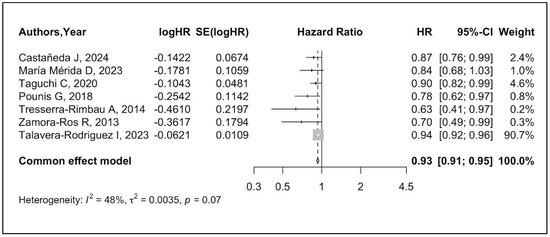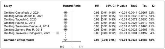 The pooled effect size of the association between dietary polyphenol intake and all-cause mortality is summarized in Figure 2. The meta-analysis shows strong and consistent evidence that higher dietary exposure to polyphenols reduces the risk of all-cause mortality by 7% (HR 0.93, 95% CI 0.91–0.95, I2: 48%) after maximum adjustment for confounders. The quality assessment of the seven studies according to the NOS showed an average high level of quality, with the majority of studies scoring between 5 and 6 (Table 3). Regarding the robustness of the overall effect sizes, we conducted LOOM analysis for sensitivity. The results of the sensitivity analysis showed that, after excluding each study at a time, higher daily dietary polyphenol consumption was still largely associated with a significant reduction in all-cause mortality risk, indicating that the results of our meta-analysis are robust (Figure 3).