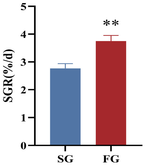 The specific growth rate of FG (3.75 ± 0.20%/d) was extremely significantly higher than that of SG (2.77 ± 0.17%/d, p < 0.01; Figure 1).