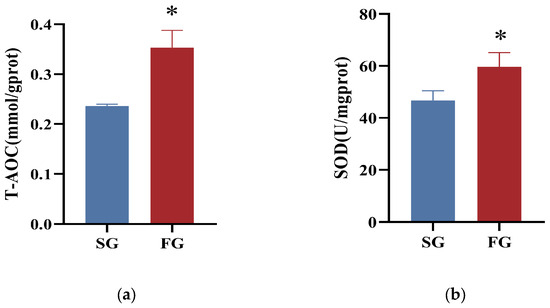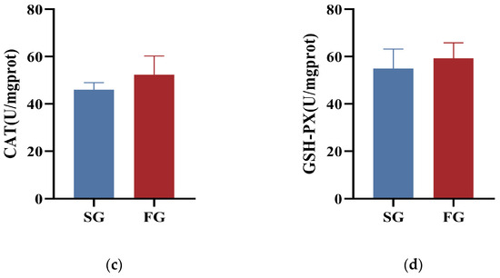 The hepatic SOD activity and T-AOC content of SG were significantly lower than those of FG (p < 0.05). In addition, there was no significant difference in activities of CAT or GSH-PX between the two groups (p > 0.05; Figure 2).