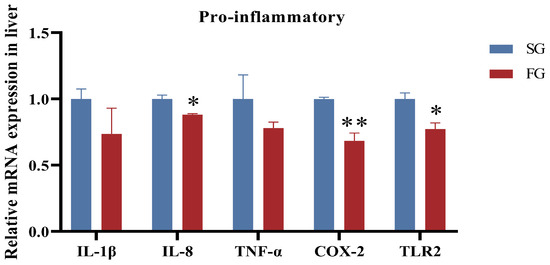 Gene expression associated with inflammatory response was assessed in the liver of fish with different growth rates. Compared with SG, the mRNA expression of IL-8, COX-2, and TLR2 was significantly lower in FG (p < 0.05), whereas the mRNA expression of IL-1β or TNF-α was not significant (p > 0.05; Figure 3).
