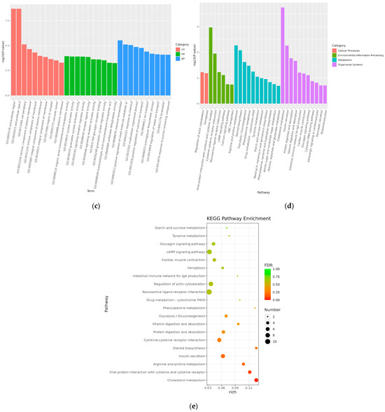 The GO and KEGG enrichment analyses were conducted to obtain the potential functions and metabolic pathways of DEGs. The GO analysis classified 431 DEGs into biological process (BP), molecular function (MF), and cellular component (CC) categories. Among these, 79.5% of DEGs were enriched in BP, 7.8% of DEGs in CC, and 12.5% of DEGs in MF. Biological processes were enriched in terms of biological process, cellular process, biological regulation, and multicellular organismal process. Cellular components were enriched in terms of cellular component, cellular anatomical entity, and cytoplasm. The molecular function and binding were enriched in terms of their respective categories. DEGs exhibited significant enrichment in specific categories (Figure 4c). DEGs were significantly enriched in chemical equilibrium, positive regulation of small molecule metabolism, positive regulation of chemical reactions, and positive regulation of calcium ion transport in BP. The significantly enriched GO terms within the molecular function category included organic anion transmembrane transport activity, cyclase activator activity, guanylate cyclase activator activity, and signal receptor modulator activity. Under the cellular component category, more genes were assigned to the GO terms of extracellular regions, extracellular spaces, cell peripheries, and intrinsic components of plasma membranes.