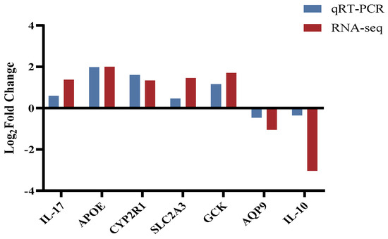 Based on an extensive literature review and the results of DEGs identified in this experiment, seven genes related to growth metabolism were randomly selected for real-time fluorescence quantitative PCR to confirm the reliability and accuracy of the transcriptomics data. The genes were interleukin-17 (IL-17), apolipoprotein Eb (APOE), vitamin D 25-hydroxylase (CYP2R1), glucose transporter 3 (SLC2A3), glucokinase (GCK), aquaporin 9 (AQP9), and interleukin-10 (IL-10). These genes were involved in neuroactive ligand–receptor interactions, the immune system, carbohydrate metabolism, and the digestive system. Based on real-time fluorescence quantitative PCR data (Figure 5), various indicators were analyzed and calculated using β-actin as a reference gene, resulting in a graph. The transcriptomics sequencing data and PCR results of the two groups were consistent, indicating the reliability of the transcriptomics results and suggesting a certain correlation between the screened DEGs and growth.