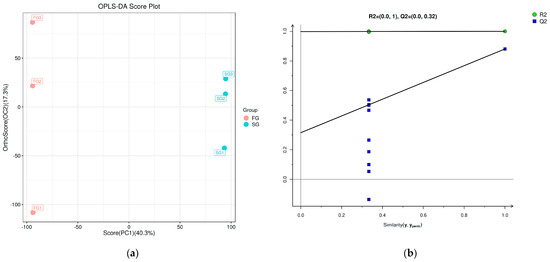 The effect of a low-phosphorus diet on the liver metabolism of spotted seabass with different growth rates was explored through metabolomics analysis. The OPLS-DA score plot and permutation test revealed a significant difference between FG and SG in both positive and negative ionization modes (Figure 6).