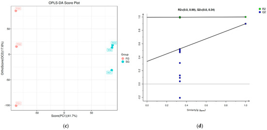 OPLS-DA score chart (a,c) and OPLS-DA permutation test chart (b,d) of metabolome profiles in the liver of fast-growing spotted seabass (FG) and slow-growing spotted seabass (SG).