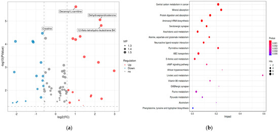Further analysis was conducted on the pathways of differential metabolites (Figure 7b). A total of 142 KEGG annotations were obtained from the identified 70 DMs. To further reveal the overall pathway enrichment characteristics of all differential metabolites, an enrichment analysis on the KEGG annotation results was conducted. Among them, the pathways of “Central carbon metabolism”, “Mineral absorption”, “Biosynthesis of plant secondary metabolites” and “Protein digestion and absorption” were dominant in both groups (Figure 7b).