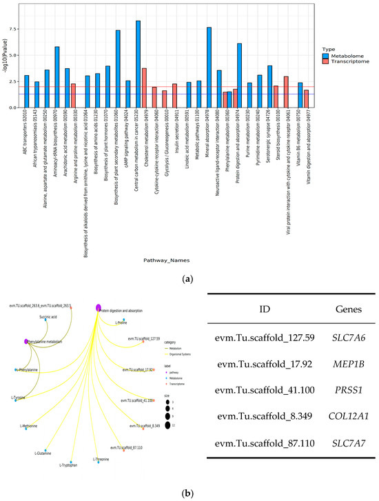 According to the integration of transcriptomics and metabolomics, two pathways were significantly enriched in both groups (Figure 8a), including “protein digestion and absorption” and “phenylalanine metabolism”. In the protein digestion and absorption pathway, the expression of PRSS1, MEP1B, COL12A1, and SLC7A7 genes was significantly up-regulated, while SLC7A6 gene expression was significantly down-regulated (Figure 8b). The products involved in the regulation included L-Glutamine, L-Methionine, L-Tryptophan, L-Phenylalanine, L-Tyrosine, L-Proline, and L-Threonine. In the phenylpropane metabolic pathway, AL3B1 gene expression was significantly up-regulated, whereas OXLA gene expression was significantly down-regulated. The products involved in regulation included Succinic acid, L-Phenylalanine, and L-Tyrosine.