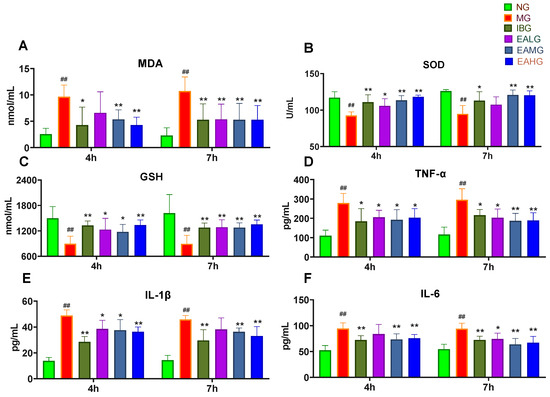 3.2. Effect of EA on MDA, SOD, GSH, TNF-α, IL-1β, and IL-6 in Serum