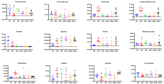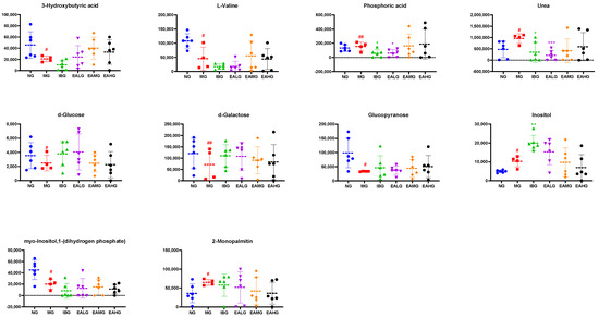 | HMDB | tR/min | Metabolite | Formula | m/z | KEGG | p | Match Score % | NG vs. MG | MG vs. IBG | MG vs. EALG | MG vs. EAMG | MG vs. EAHG |