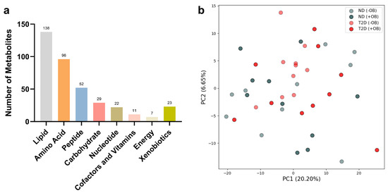 Principal Component Analysis (PCA) in Adipose Tissue annotated with T2D and Obesity Status. (a) Number of metabolites used for PCA analyses in each metabolic class in SAT from subjects with and without T2D. (b) PCA plot reveals the clustering of adipose tissue samples from subjects with or without T2D (ND) and with or without obesity (+/− OB). Each point represents an individual sample, with color coding based on T2D status (red for subjects with T2D, grey without T2D) and different shades indicating obesity status (darker for individuals with obesity, lighter for individuals without obesity). The axes represent the first two principal components (PC1 and PC2), accounting for the highest percentage of variance.