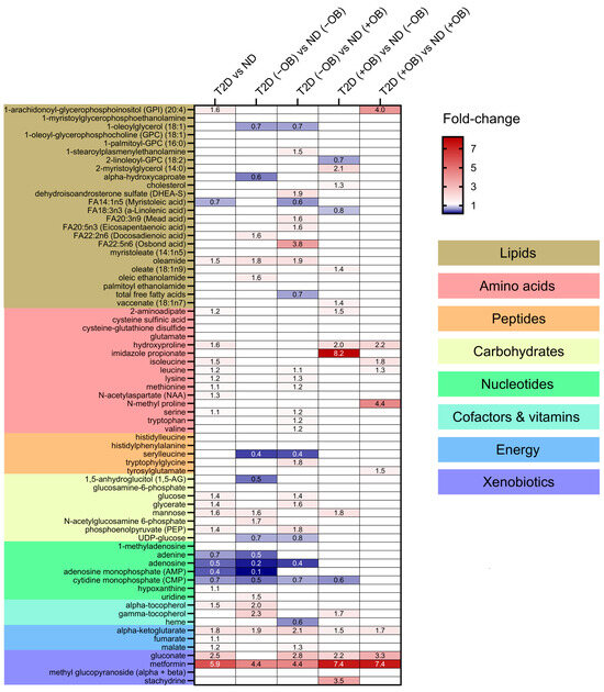Differential metabolite levels in Adipose Tissue in Subjects with and without T2D and Obesity. Heatmap representing the relative abundance (fold change) of the 38 significantly different metabolites identified in a comparison of subjects with and without T2D and ND individuals and sub-group analyses between four groups defined by both T2D and obesity status: subjects without T2D and obesity, ND (−OB); individuals without T2D and with obesity, ND (+OB); individuals with T2D and without obesity, T2D (−OB); and individuals with both T2D and obesity, T2D (+OB). Metabolites are grouped and colored according to their category type: lipids, amino acids, peptides, carbohydrates, nucleotides, cofactors and vitamins, energy-related metabolites, and xenobiotics, with color-coded sections indicating these classes. The color scale indicates the fold change in metabolite levels, with red indicating an increase and blue indicating a decrease between groups.