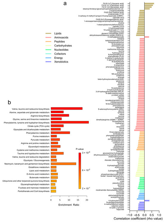 Correlation Analysis of Adipose Tissue Metabolites with Adipocyte Size. (a) A heatmap displaying the correlation coefficients (rho-values) of individual metabolites with adipocyte size. (b) A bar graph showing the enrichment ratio of the top metabolic pathways significantly associated with adipocyte size.