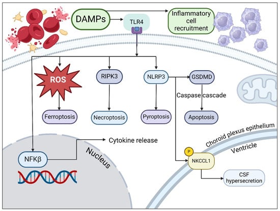 Summary of pathways involved in hemorrhagic hydrocephalus. Damage-associated molecular patterns (DAMPs) activating toll-like receptors (TLRs), as well as leading to inflammatory cell recruitment, causing (1) reactive oxygen species generation; (2) receptor-activating protein kinase 3 (RIPK3) activation with resultant necroptosis; (3) NOD-like receptor family pyrin domain-containing 3 (NLRP3) inflammasome activation and resultant pyroptosis, Gasdermin D activation leading to apoptosis, and phosphorylation of sodium, potassium chloride co-transporter-1 (NKCCL1) by the NLRP3 inflammasome complex in the choroid plexus epithelium, resulting in CSF hypersecretion (GSDMD: Gasdermin D; NFK: nuclear factor kappa beta; ROS: reactive oxygen species (created with BioRender.com, accessed on 12 June 2024)).
