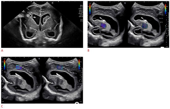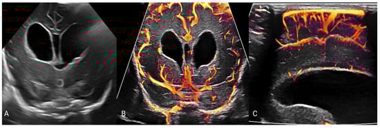 Series of images in a 22-day-old preterm female with hydrocephalus secondary to intraventricular hemorrhage. (A) shows the coronal view in grayscale at the level of the lateral ventricles, showing a marked increase in ventricular size and layering blood products within the ventricles. (B,C) show microvascular imaging of the slow-flowing vessels in coronal (B) and sagittal (C) planes, with relative velocity shown by faster flow in yellow and less fast in orange to red (images under creative commons license https://creativecommons.org/licenses/by-nc/4.0/ accessed on 25 July 2024 []).