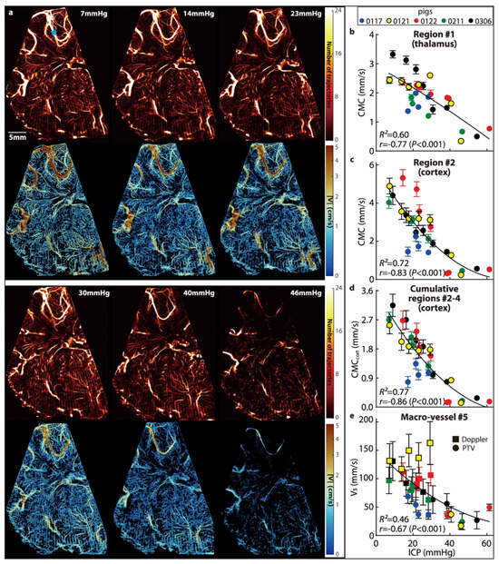 (a) Cerebral blood vessels (top row) and the corresponding velocity distributions (bottom row) for piglet 0121, demonstrating the effect of increasing intracranial pressure on the cerebral perfusion as detected by super-resolution ultrasound. (b–d): Relationships between intracranial pressure and the cerebral microcirculation (CMC, original cohort) parameters in the thalamus (b), in cortical subregion 2 (c), and in all three cortical subregions combined ((d), CMCcort). (e) Relationships between the intracranial pressure and the time-averaged velocity (V5) in the macro blood vessel are marked with a blue star in (a). For (b–e), data are presented as mean +/− SD, where the error bars show the temporal standard deviations of CMCs or V5 over 20 cardiac phases; several standard deviation values for high ICP are too small to be shown. The curves are least-square fitted quadratic functions, with the corresponding coefficient of determination (R2) shown on each plot. Also presented are the correlation coefficients (r) and the corresponding p values between the CMCs or V5 and the ICP. Images under creative commons license, http://creativecommons.org/licenses/by/4.0/ (accessed on 24 May 2024) [].