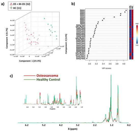 Illustration of the most significant NMR lipidomic results. The PLS-DA obtained for osteosarcoma with and without metastasis (OS + M-OS) patients (red color) and healthy control (HC, green color): (a) score plot using spectral region between δ 0.20 and 6.80, with 23.3% variance in PC 1, 11.0% in PC 2 and 4.7% in PC 3; (b) VIP values generated by PLS-DA model; (c) overlap of 1H-NMR (δ 0.20–6.80) mean spectra of the lipids and above; the overlap of 1H-NMR (δ 1.90–6.50) mean spectra with increased intensity. Chemometrics results were obtained on the MetaboAnalyst platform. OBS: Samples were analyzed in duplicate; however, not all data were used for PLS-DA.
