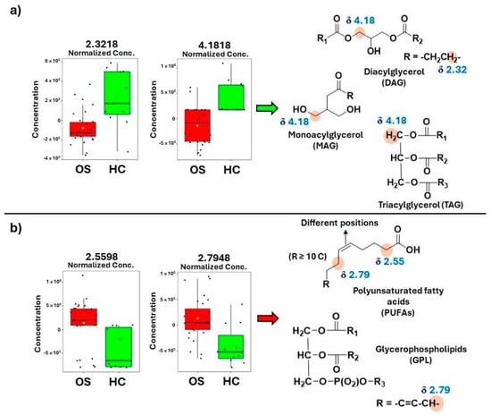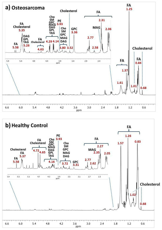 1H-NMR spectra (δ 0.00–6.80) acquired using zg30 pulse sequence: (a) representative serum lipid extracts of OS patients and (b) healthy control. Abbreviations: Cho, choline; DAG, diacylglycerol; FA, fatty acyls; GPC, glycerophosphocholine; GPL, glycerophospholipid; MAG, monoacylglycerol; PE, phosphatidylethanolamine; SM, sphingomyelin; TAG, triacylglycerol. A more detailed assignment of the peaks of 1H-NMR spectra is shown in Table S3 in the Supplementary Materials.