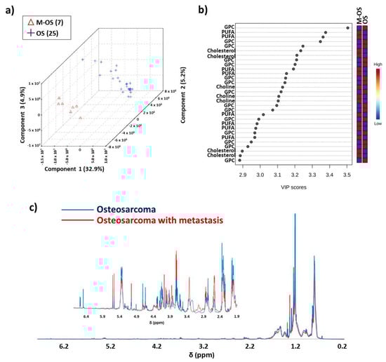 Illustration of classification results for the PLS-DA obtained for osteosarcoma patients with metastasis (M-OS, red color) and without metastasis (OS, blue color) at diagnosis: (a) score plot using spectral region between δ 0.20 and 6.80, with 32.9% variance in PC 1, 5.2% in PC 2 and 4.9% in PC 3; (b) VIP values generated by PLS-DA model; (c) overlap of the 1H-NMR (δ 0.20–6.80) mean spectra of the lipid extracts and above; the overlap of 1H-NMR (δ 1.90–6.50) mean spectra with increased intensity. Chemometrics results were obtained using the MetaboAnalyst platform. OBS: Samples were analyzed in duplicate; however, not all data were used in PLS-DA.