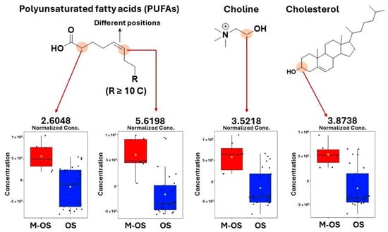 An increase in NMR peak intensities between δ 3.77 and 3.83 was assigned to cholesterol. Cholesterol is a lipid component of cell membranes, together with GPLs and sphingolipids [45]. Cholesterol was previously reported as a biomarker in osteosarcoma prognosis since differentiation was observed in glycolysis and cholesterol synthesis-related genes (GCSRGs) per tumor subtype and its microenvironments [46]. Figure 3 illustrates box plots of important OS and HC classification variables.