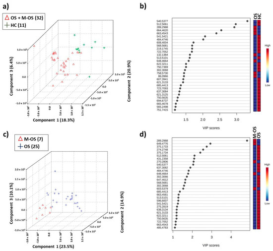 PLS-DA of the ESI(+) LC-MS chromatograms using osteosarcoma (OS) samples, osteosarcoma with metastasis (M-OS), and healthy control (HC): (a) score plot in OS + M-OS (red color) × HC (green color) analysis with 18.3% variance in PC 1, 20.9% in PC 2, and 6.4% in PC 3; (b) VIP scores generated in OS × HC analysis; (c) score plot in M-OS (red color) × OS (blue color) analysis with 23.5% variance in PC 1, 14.9% in PC 2, and 10.1% in PC 3; (d) VIP scores generated in M-OS × OS analysis.