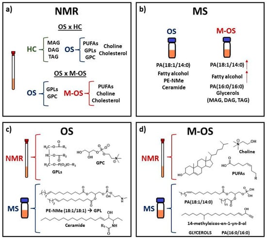 The variable m/z 603.5379 indicated an increase in intensity after the metastasis process (Figure 6d). The mass-to-charge ratio of 603.53 has been reported in the fragmentation pattern of DAGs and TAGs [60,61]. Although glycerols were found in higher intensity in HC samples (Figure 3) due to the increase in the expression of enzymes such as MAGL and DGK during cancer [28,29,34], the increase in DAG and TAG levels during metastasis could be a mechanism used to consume energy and release stored fatty acids from triglycerides for the formation of cancerous cells [6]. Figure 7 shows a summary of potential biomarkers for each group (HC, OS, and M-OS), and Figure 8 summarizes the potential biomarkers of osteosarcoma and metastasis.