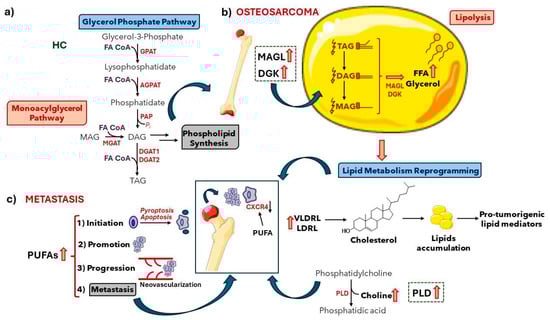 In health control (HC, Figure 8a), monoacylglycerols (MAGs), diacylglycerols (DAGs), and triacylglycerols (TAGs) are intermediates and/or biosynthesized in the glycerol–phosphate pathway [70], while in osteosarcoma disease (Figure 8b), a higher overexpression of monoacylglycerol lipases (MAGLs) and diacylglycerol kinases (DGKs) have been reported [28,34]. These enzymes convert MAGs, DAGs, and TAGs to free fatty acids (FFAs) and glycerol during lipolysis in adipocytes [70].