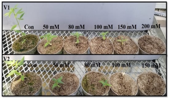 Seeds were planted in pots (10 cm (diameter) × 8 cm (depth)) containing 60 g of sterilized vermiculite (Therm-O-Rock-East, Inc., PA, USA) and kept on plastic saucer (15.2 cm (diameter)) to provide water and nutrients from the bottom of pots. Salt treatments were provided by adding 100 mL each of 0, 50, 80, 100, 150, and 200 mM NaCl solution before planting seeds. Plants were grown for 30 days, and nutrients were provided using 1/4th strength of Hoagland solution [KNO3 (14 mM), Ca(NO3)2.4H2O (7 mM), KH2PO4 (4 mM), MgSO4.7H2O (1 mM), H3BO3 (25 µM), MnSO4.H2O (2 µM), ZnSO4.7H2O (2 µM), CuSO4.5H2O (0.5 µM), (NH4)6Mo7O24.4H2O (0.5 µM), and Fe-EDTA (20 µM)] on a weekly basis []. All the reagents were purchased from Fischer Scientific (Chicago, IL, USA). Pots were kept in greenhouse in natural light condition (700–750 µmole m−2 s−1 photosynthetically active radiation (PAR). The PAR reached 400 µmole m−2 s−1 (Spectrum Technologies, Inc., Aurora, IL, USA) on a cloudy day. Greenhouse were operated at 27 ± 2 °C temperature, 75% relative humidity, and 12 h photoperiod. Positions of pots were changed randomly to avoid positional effect. Plants were removed by washing roots with deionized water. Fully expanded leaves were processed for biochemical assays at 30 days after sowing seeds. Three independent experiments were conducted in a randomized complete block design from June to August 2022. Fifteen replicates were used for the estimation of all the biochemical parameters. All the biochemical assays were evaluated up to 100 mM NaCl in the leaves of V1 and up to 80 mM concentration in V2. Seedlings in V1 and V2 did not survive at 200 mM and 100 mM NaCl, respectively, by 30th day. Data are plotted for V1 only at 100 mM NaCl to show the elevated levels of antioxidant enzymes; while at this NaCl concentration, plants did not survive in V2 (Figure 1).