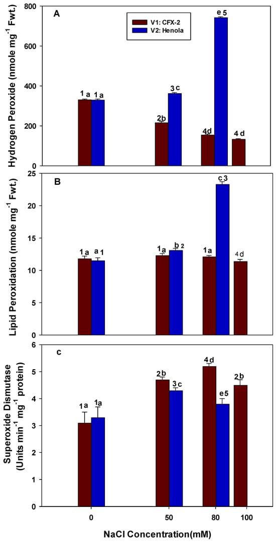 The effects of NaCl on the IH leaf H2O2 concentration (Panel (A)), lipid peroxidation (Panel (B)), and SOD-specific activity (Panel (C)). Vertical bars represent SE. Different lowercase letters indicates significant differences among the varieties, and different numerals represents significant treatment differences. These mean values (n = 15) are separated using LSD at p < 0.05. Data at 100 mM NaCl are given for V1 only, as plants did not survive in V2 at this NaCl concentration. Interactions were non-significant.