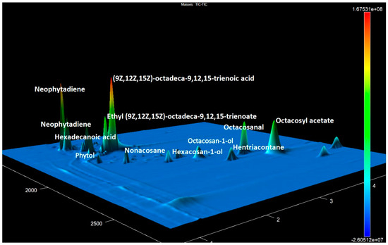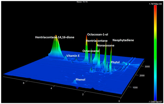 The GCxGC-TOF MS chromatogram fragment of accession No. 25 contains the predominant 14,16-hentriacontanedione and other components with a high abundance.