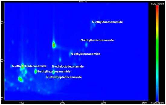 The GCxGC-TOF MS chromatogram fragment of accession No. 1 contains the most prevalent compounds of the fatty acids N-ethylamides.