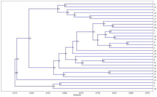 Dendrogram of hierarchical clustering for all identified components of extracts of 30 wheat varieties. Similarity indices are plotted on the Y-axis, and accession identification numbers are plotted on the X-axis.
