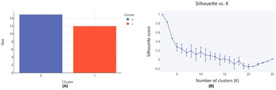 Clustering diagram of structurally similar compounds from diet-derived metabolites in human subjects following a blueberry diet intervention. (A) The plot depicts the relationship between cluster size and the number of clusters. Cluster-0 comprises 15 metabolite compounds, while Cluster-1 encompasses 12 metabolite compounds. (B) The plot illustrates the Silhouette score versus the number of clusters (K), with a Silhouette score of 0.9989 ± 0.0028 achieved for K = 2. A Silhouette score approaching 1 indicates effective clustering.