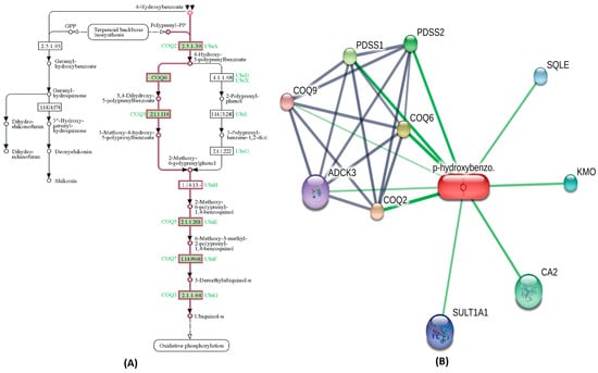 The metabolic pathway interaction network of Cluster-0 metabolite (4-hydroxybenzoic acid). (A) The KEGG pathway for 4-hydroxybenzoic acid involvement in oxidative phosphorylation is distinctly highlighted in a pink color. (B) In the STITCH interaction network for 4-hydroxybenzoic acid, Coenzyme Q2 (COQ2) and Coenzyme Q6 (COQ6), along with CA II, emerge as the nearest and most robust interaction partners, depicted by prominent green lines.