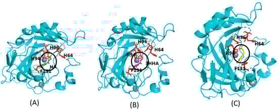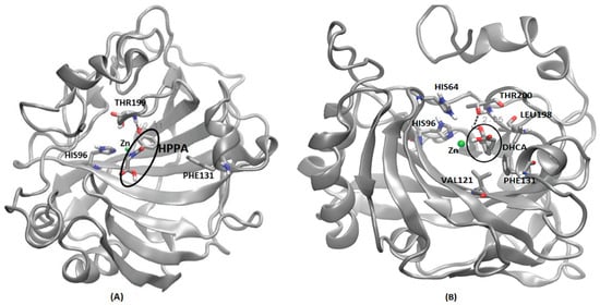 Except CA I and CA VII, all other CAs showed the strongest binding affinity with 3-Hydroxyhippuric acid (HHPA) (Table 3). HHPA occupied a similar binding cavity in the CAs proteins, near the Zn binding cavity. CA II interaction with HHPA forms a strong hydrogen bond of 2.11 Å with THR199 and resides within the binding crevice between HIS64 and THR199 (Figure 8A). In a similar study [], a brinzolamide molecule occupied the same binding pocket in the Zn residing cavity, surrounded by the residues HIS64, PHE131, PRO202 andTHR199. Unlike HHPA, brinzolamide was not reported to form any hydrogen bond-based interaction with the surrounding residues, except van der Waals contacts with PHE131 and PRO202. Similarly, in the case of CA III, HHPA resides in the Zn binding pocket, forming hydrogen bond interactions with ASN62 and THR200. The amino side chain of ASN62 forms a strong hydrogen bond (2.60 Å) with the carboxylic tail of 3-Hydroxyhippuric acid. Also, the THR200 side chain of CA III forms a strong hydrogen bond (1.99 Å) with 3-Hydroxyhippuric acid (Supplementary Figure S6B). A similar interaction for CA III’s interaction with histidylhistidine has been reported, where the imidazole ring of PHE198, along with residues LYS64, ASN67 and THR200, play an important role in ligand binding []. CA IV also displays a Zn binding cavity as a binding site for 3-Hydroxyhippuric acid, forming a hydrogen bond interaction with residues THR199 (2.21 Å), GLN92 (3.98 Å), ASN (2.22 Å), and THR200 (3.23 Å) during MD simulations (Supplementary Figure S6C). The experimental study of different CA IV inhibitors such as acetazolamide, benzenesulfomide, ethoxaolamide and topiramate, along with their derivatives, show that these compounds also occupy the Zn binding site, interacting with the residues TRP6, ASN69, HIS71, GLN96, HIS98, VAL125, ILE146, THR200, THR209 and TRP218 surrounding the Zn binding cavity []. As the human CA V was not available (either as an X-ray crystal or NMR structure), we have considered the murine CA V structure for this study. Our MD simulations show that 3-Hydroxyhippuric acid occupies the usual Zn binding cavity, with hydrogen bond interaction with THR199 (2.14 Å) (Supplementary Figure S6D). However, ligand binding studies of CA VA have not been reported so far in the literature. For CA VI, HHPA occupies the Zn binding site surrounded by the residues HIS94, HIS96, HIS119, ASN62, THR200 and THR199, forming a strong hydrogen bond (2.14 Å) interaction with THR199 (Supplementary Figure S6E). Direct evidence for the crystallographic structures of inhibitors binding to CA VI is not available; however, a site-directed mutagenesis of CA VI, called a CA VI-mimic, was shown to have bound a series of benzene sulfonamides in the Zn binding pocket, as is typical for all the other CAs []. In the case of CA IX, MD simulations shows that HHPA was not able to bind in the binding pocket near Zn binding site as seen in other CAs. The ligand is embedded between the loops in the protein surrounded by the residues GLY365, PRO366, GLN372, ASN374, GLY144 and LEU 371 (Supplementary Figure S6F). MD simulations have shown that the highly unstructured c-terminal region, along with the loops surrounding the Zn embedded region, might have prevented the ligand from entering the Zn binding site. However, in an experimental study, it was shown that various sulfonamides and their derivatives interact with CA IX through a binding mechanism that involves a binding site coordinated by the Zn ion in the protein’s active site. Crucial amino acid residues in CA IX for sulfonamides’ ligand binding include HIS94, HIS96, and HIS119, which coordinate the Zn ion, and THR200, which interacts with the sulfonamide group of the inhibitor, involves both the protein and the ligand undergoing protonation–deprotonation reactions []. To verify our MD simulations, further studies that involve Steered Molecular Dynamics will be applied to understand the entry and exit mechanisms of metabolites in CA IX, similar to our previous studies [,,,]. For CA XII, HHPA occupies the Zn binding site of protein surrounded by the residues THR199, THR200, SER132 and LEU198, with which the side chain of THR199 forms a hydrogen bond with 3-Hydroxyhippuric acid (Supplementary Figure S6G). Similar interactions were reported in experimental studies, where ligands, such as sulfonamides and their derivatives, interact with CA XII through a binding mechanism that involves a binding site coordinated by the Zn ion in the protein’s active site. Key amino acid residues in CA XII crucial for ligand binding include His94, His96, and His119, which coordinate the Zn, similar to CA IX, but with additional involvement from residues such as Thr198, which interacts with the sulfonamide group of the inhibitor []. For CA XIII, MD simulations show that HHPA binds in the Zn binding pocket surrounded by the residues HIS94, HIS96, HIS119 and THR199 (Supplementary Figure S6H), similar to the experimental results, where acetazolamide was reported to bind CA-XII primarily through interactions involving the Zn ion at the active site. The key residues crucial for this binding are HIS94, HIS96, and HIS119, which coordinate the Zn ion, and THR200, which is important for stabilizing the inhibitor’s binding []. In the case of CA XIV, HHPA binds near the Zn binding site surrounded by the residues HIS119, HIS94, HIS96 and THR199 (Supplementary Figure S6I). Our MD simulation results are similar to the experimental study, where it has been established that acetazolamide, a well-known inhibitor of CA enzymes, interacts with CA-XIV primarily through several key residues. The crystallographic studies reveal that acetazolamide binds in the active site of CA XIV form crucial interactions with residues such as THR199, GLU106, and HIS64 []. These residues are pivotal in stabilizing the sulfonamide group of acetazolamides through hydrogen bonds and van der Waals interactions. Compared to