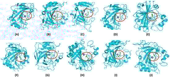 Predicted binding site of a single metabolite with all the CA family proteins. The docked state of 3-hydroxyhippuric acid, represented in green and depicted in licorice form, is illustrated near the Zn (depicted as a silver-colored sphere) binding site across various CA family proteins. The binding site of 3-hydroxyhippuric acid is consistently highlighted within the red circle for clarity. (A) CA II, (B) CA III, (C) CA IV, (D) CA V, (E) CA VI, (F) CA VII, (G) CA IX, (H) CA XII, (I) CA XIII, (J) CA XIV. Notably, 3-hydroxyhippuric acid occupies a similar binding site across all CA family proteins.