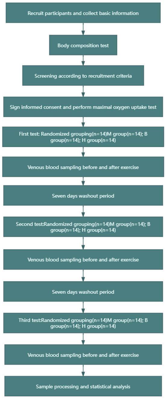 In order to reduce the influence of relevant variables, the subjects were asked to do the following before the test: (1) Before and after exercise, the subjects were asked to record their food intake over a 24-h period and were asked to eat the same food (specifically, fixed window food from a selected Jilin Normal University dining hall) during that 24-h period; (2) they were told to avoid engaging in other strenuous exercise before participating in the experimental test in order to prevent any impact on the sample indexes; (3) they were asked to refrain from eating for 8 h prior to the experimental test, while the same standardised training meal was provided 1 h prior to exercise, with the content of the training meal being in line with the recommended nutrient intake; and (4) the inter-test washout period was 7 days for each group, and to control for the effects of biorhythms, the testing time was scheduled to be between 2 pm and 5 pm for all groups.