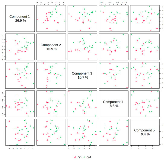 Plot of PLS-DA multivariate statistical scores before exercise for both groups. QM (pre-exercise in MICT group), QB (pre-exercise in MICT+BFR group).