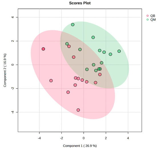 Figure 2 presents the PLS-DA score plot, showing better aggregation of pre-exercise samples in the two groups—26.9% in PC1 and 16.9% in PC2—but does not show a significant separation between QM (pre-exercise in MICT group) and QB (pre-exercise in MICT+BFR group).