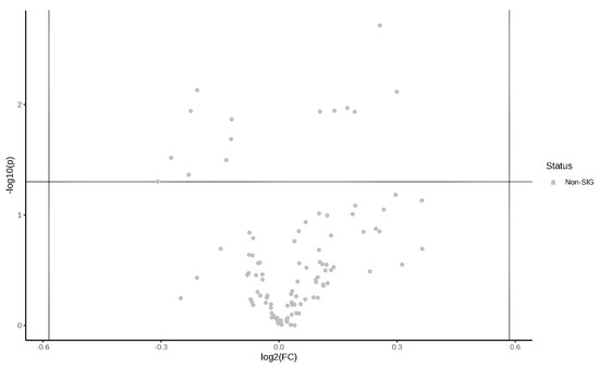 Volcano plot of pre-exercise plasma metabolite: The results of the analysis of the FC values were plotted as horizontal coordinates, and the results of the sample t-tests were plotted as vertical coordinates so as to screen the important metabolites by biological significance and statistical significance. Significantly expressed metabolites were screened by using an FC ≥ 1.5 or ≤0.67 with a p-value < 0.05, with those closer to the top representing more significant differences.