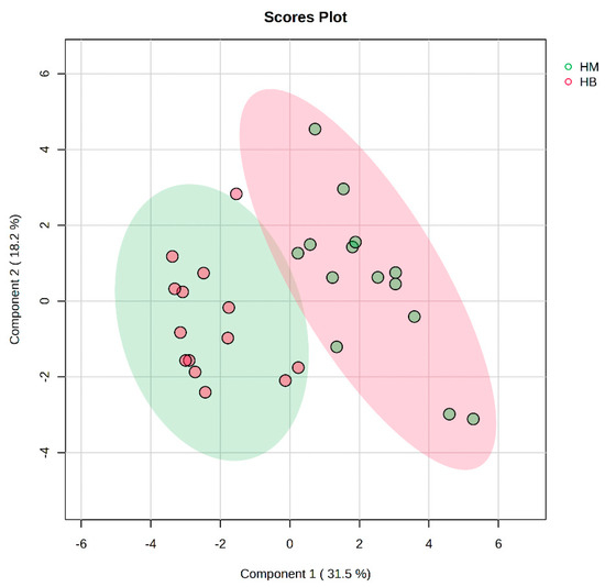 In Figure 7, the PLS-DA score plot shows better aggregation of the samples after exercise in both groups, with 31.5% for PC1 and 18.2% for PC2, showing a more pronounced separation between HM (after exercise in the MICT group) and HB (after exercise in the MICT+BFR group).