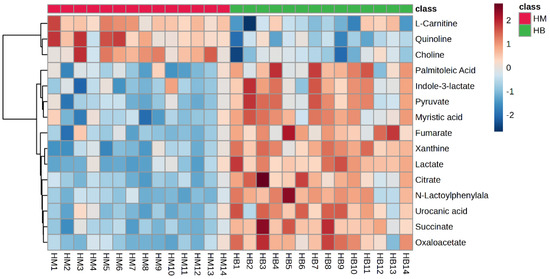 The plasma metabolite difference hotspot map after exercise in the MICT group and the MICT+BFR group is shown in Figure 9 using Ward’s clustering method and the Euclidean measurement method. Compared with the post exercise of group M, the red positive value on the right side of the picture represents upregulation, and the blue negative value represents downregulation. The results showed that a total of 15 different metabolites were extracted (TOP15), among which 12 metabolites were upregulated and 3 were downregulated.