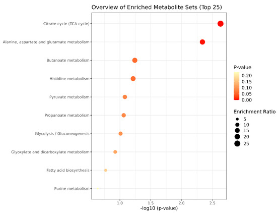 Finally, enrichment analysis was performed, and the results showed that the metabolic pathways with p < 0.05 mainly included the citric acid cycle (TCA cycle), pyruvate metabolism, glycolysis/glycogen isomerisation, alanine, aspartate and glutamate metabolism, and the synthesis and degradation of ketone bodies.