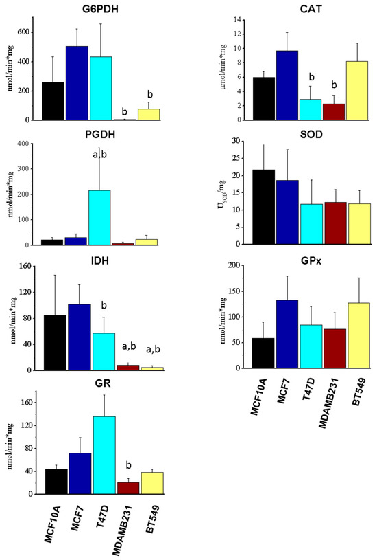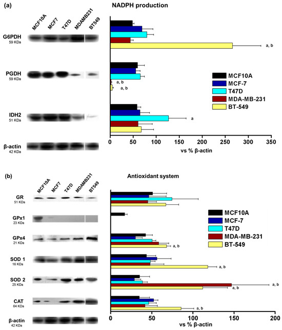 Protein levels of NADPH-producing enzymes (a) and proteins from the antioxidant system (b) from normal (MCF10A) and tumor (MCF7, T47D, MDAMB231 and BT549) breast cancer cell lines. Bar graphs show normalization against β-actin. The data shown represent the mean ± S.D. of three different preparations. G6PDH, glucose-6-phosphate dehydrogenase; PGDH, 6-phosphogluconate dehydrogenase; IDH2, isocitrate dehydrogenase 2; GR, glutathione reductase; GPx, glutathione peroxidase; SOD, superoxide dismutase; CAT, catalase. ANOVA/post hoc Tukey analysis. a represents p < 0.05 vs. MCF10A; and b represents p < 0.05 vs. MCF7. Blots included in the figure are from the same membrane; for more details, see Section 2.3.