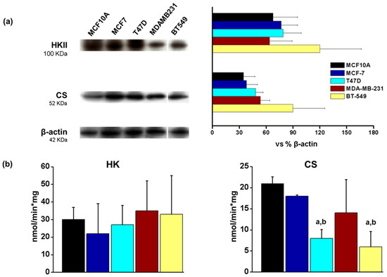 Protein levels and activity of hexokinase (HK) and citrate synthase (CS). (a) Histograms represent data normalized to β-actin levels, the data show mean ± S.D. of three different preparations. (b) Activities of HK and CS. The data show the mean ± S.D. of 3–5 different preparations. ANOVA/post hoc Tukey analysis with a representing p < 0.05 vs. MCF10A and b, p < 0.05 vs. MCF7. Blots included in the figure are from the same membrane; for more details, see Section 2.3.