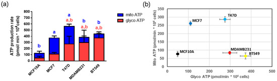 Mitochondrial and Glycolytic ATP production in a panel of breast cancer cell lines. ATP production was measured in non-tumorigenic (MCF10A) cells, ER+ (MCF7 and T47D) and TN (MDAMB231 and BT549) breast cancer cell lines. In (a), data show mean +/− SD from 3–7 independent experiments. a shows differences with respect to MCF10A and b with respect to MCF7 (p < 0.05), blue and red letters represent differences in mitochondrial (mito) ATP and glycolytic (glyco) ATP, respectively. In (b), the same data are shown, using mean ± SEM for clarity. One-way ANOVA, Dunnett’s post hoc.