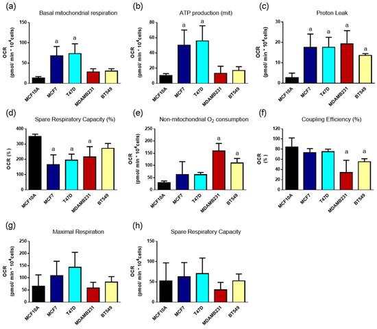 Mitochondrial parameters evaluated in a panel of breast cancer cell lines, including a non-tumorigenic control (MCF10A), ER+ (MCF7 and T47D) and TN (MDAMB231 and BT549) breast cancer cell lines. (a) Basal mitochondrial respiration, (b) ATP production, (c) Proton leak, (d) Spare respiratory capacity, (e) Non-mitochondrial O2 consumption, (f) Coupling efficiency, (g) Maximal respiration and (h) Spare respiratory capacity. Data show mean ± SD of 3–4 independent experiments performed in replicates. Each graph mentions the mitochondrial parameter evaluated; a represents differences with p < 0.05 when compared to MCF10A non-tumorigenic control. One-way ANOVA, Dunnett’s post hoc.