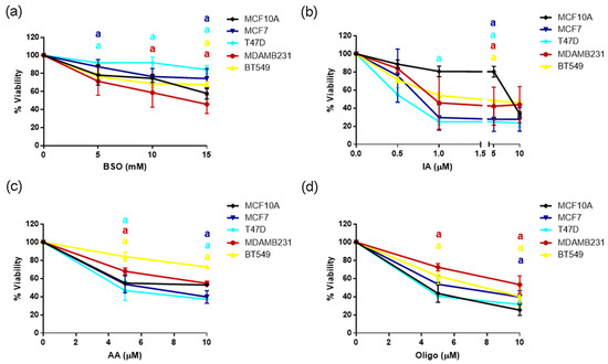 Sensitivity to ROS-inducing agents, or metabolic inhibitors: (a) BSO, buthionine sulfoximine; (b) IA, iodoacetate; (c) AA, antimycin A; (d) oligo, oligomycin A in the non-tumorigenic control (MCF10A), ER+ (MCF7 and T47D) and TN (MDAMB231 and BT549) breast cancer cell lines. Data show mean ± SD of 3–4 independent experiments performed in replicates. a p < 0.05 when compared to MCF10A non-tumorigenic control. Two-way ANOVA, Dunnett’s post hoc.