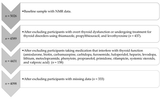 The ELSA-Brasil is a large, multicenter and prospective cohort study that has been following a population of middle-aged and older Brazilian adults for 15 years. The baseline data collection occurred between 2008 and 2010 with a widely comprehensive health assessment, which included laboratory and imaging tests. The design and detailed information about ELSA-Brasil have been published elsewhere [33,34,35,36]. In the current analysis, we included the participants from the São Paulo research center of ELSA-Brasil [35] with nuclear magnetic resonance (NMR) data available at baseline (n = 5026). Then, we excluded (1) those with overt thyroid dysfunction or using medication to treat thyroid diseases (thiamazole, propylthiouracil, and levothyroxine)—n = 437; (2) those that were taking medication that interfere with thyroid function (amiodarone, biotin, carbamazepine, carbidopa, furosemide, haloperidol, heparin, levodopa, lithium, metoclopramide, phenytoin, propranolol, primidone, rifampicin, systemic steroids, and valproic acid)—n = 158; and (3) those with missing data in any independent variable or covariate—n = 333. The total number of participants analyzed was 4098 and it included those with subclinical thyroid diseases and with normal thyroid function (Figure 1). The institutional ethics committee approved this study, and written informed consent was obtained from all participants.