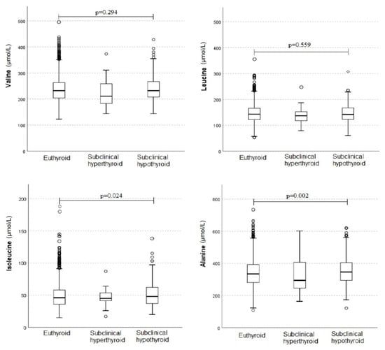 Comparison of valine, leucine, isoleucine, and alanine level distribution according to thyroid function. When compared to euthyroid participants, participants with subclinical hypothyroidism showed higher mean values of isoleucine (50.7 vs. 48.6; p = 0.024) and alanine (353.1 vs. 339.5; p = 0.002). All other comparisons were not significant (p > 0.05).